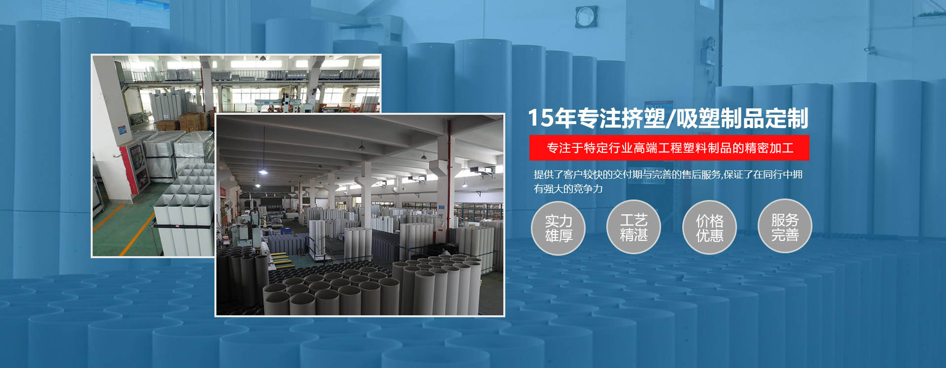 8000平米標(biāo)準(zhǔn)廠房,1500噸年產(chǎn) 能,引進(jìn)國(guó)內(nèi)高端品牌真空吸塑成型機(jī)和五軸精密加工中心。